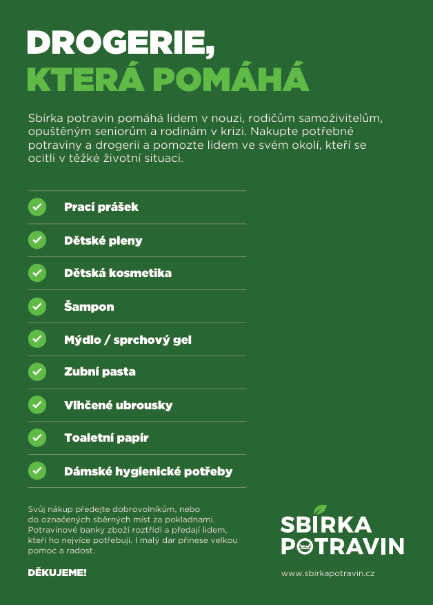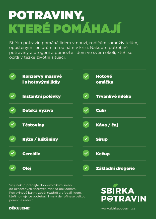 Potravinová sbírka se blíží!8. listopadu můžete pomoci těm, kteří to nejvíce potřebují. Stačí málo, trvanlivé potraviny nebo drogerie mohou udělat velký rozdíl. Děkujeme, že pomáháte s námi. 💚